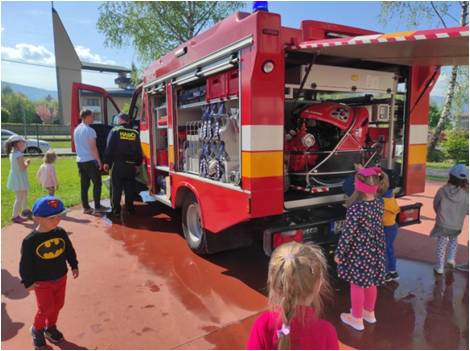 Utorok (10.5.2022) bol pre naše deti v Materskej škole výnimočný deň. Deti s nadšením sledovali, keď do areálu MŠ prišlo hasičské auto a vystúpili z neho skutoční hasiči miestneho Dobrovoľného hasičského zboru Gbeľany.