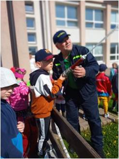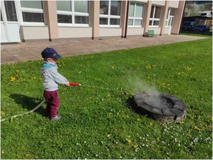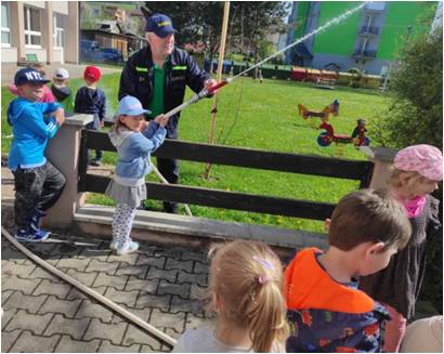 Skutočnú radosť však prežívali, keď si vyskúšali ako sa používa požiarna hadica, a tak sa stali na chvíľu „skutočnými“ hasičmi. Striekali hadicou vodu a hasili požiar.