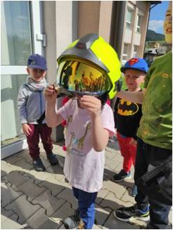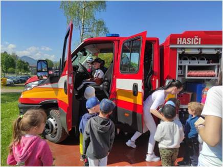 Predviedli nám svoje uniformy a špeciálny zásahový oblek, ktorý sa používa pri hasení požiaru. Deti mali možnosť prezrieť si kompletnú výbavu hasičského auta, mohli sivyskúšať hasičské prilby a nasadnúť do hasičského auta.