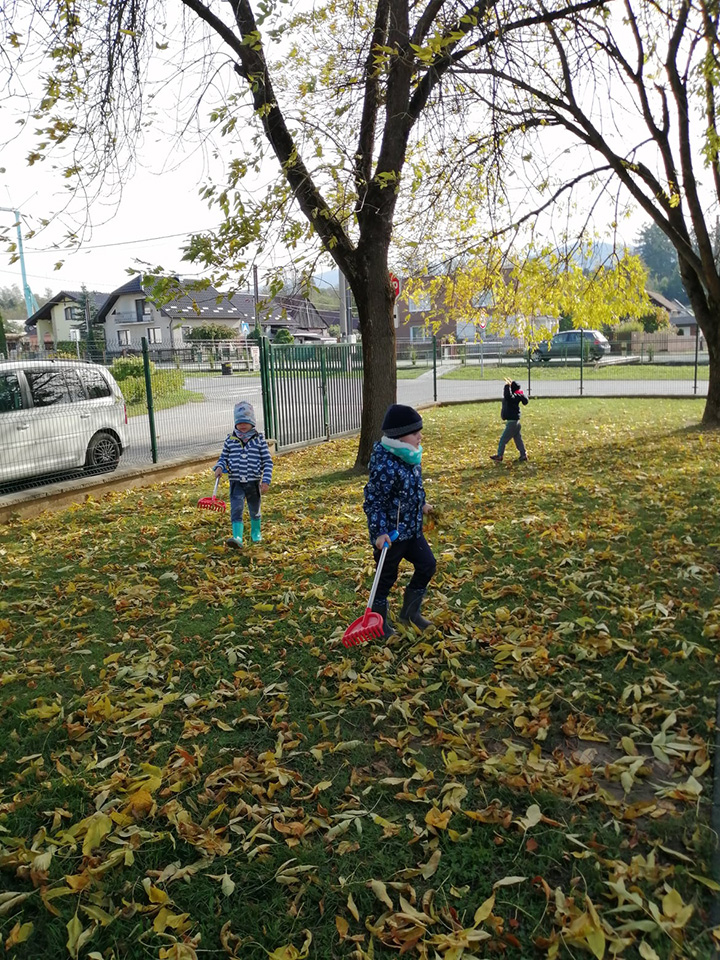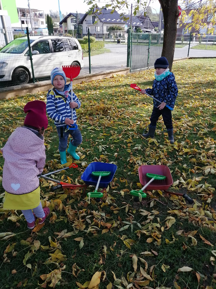 Ako sa hovorí "Práca šľachtí" a tak aj my vedieme našich drobcov k pracovným návykom a starostlivosti o svoju škôlku. Pridali sme ruku k dielu a pobrali sme hrabličky a fúriky a vyskúšali sme si prácu dospelých. Hrabanie lístia a zber gaštanov bola pre deti zábava.