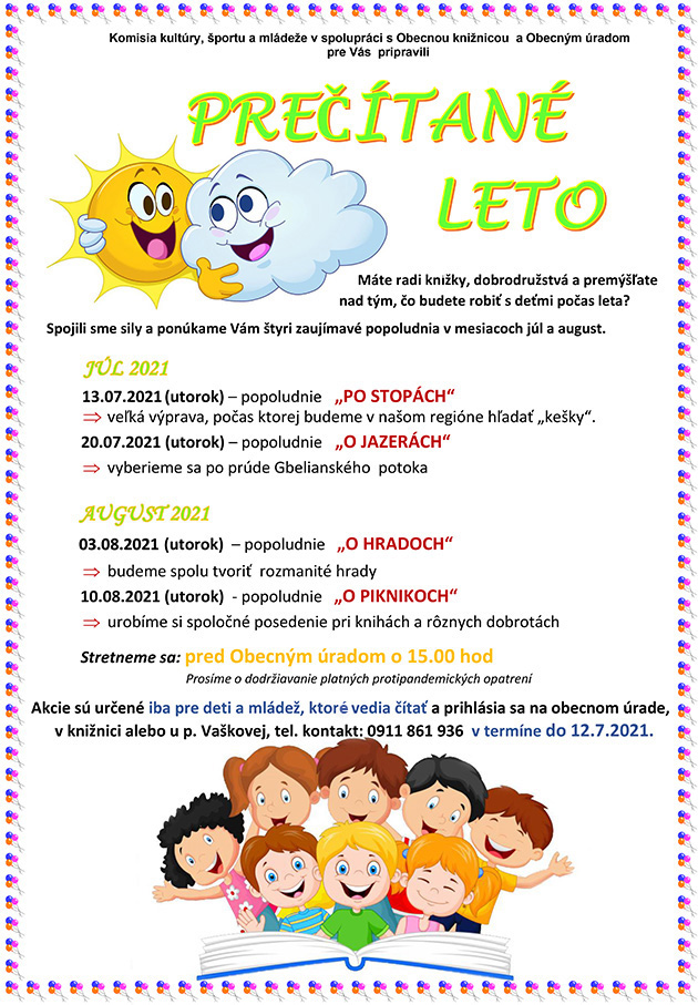 Máte radi knižky a dobrodružstvá? Komisia kultúry, športu a mládeže v spolupráci s Obecnou knižnicou a Obecným úradom pre Vás pripravili PREČÍTANÉ LETO. Akcie sú určené iba pre deti a mládež, ktoré vedia čítať a prihlásia sa na obecnom úrade, v knižnici alebo u p. Vaškovej do 12.7.2021.
