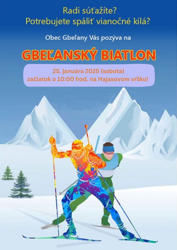 Obec Gbeľany Vás pozýva na GBEĽANSKÝ BIATLON, ktorý sa uskutoční 25. januára 2025 (sobota). Začiatok o 10.00 hod. na Hajasovom vŕšku!