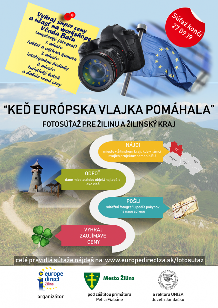 Informačné centrum EUROPE DIRECT Žilina vyhlasuje fotosúťaž na tému „Keď európska vlajka pomáhala“, pri príležitosti Európskeho volebného roka. Cieľom súťaže je prezentovať rozmanitosť a silu európskej spolupráce založenej na solidarite, invenciách, multikultúrnom dialógu, zvyšovaní dostupnosti jednotlivých regiónov Európy.