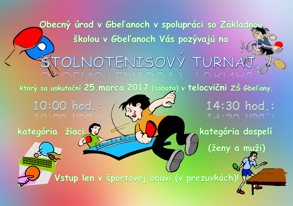 Stolnotenisový turnaj sa uskutoční 25. marca 2017 v telocvični ZŚ o 14.30hod.