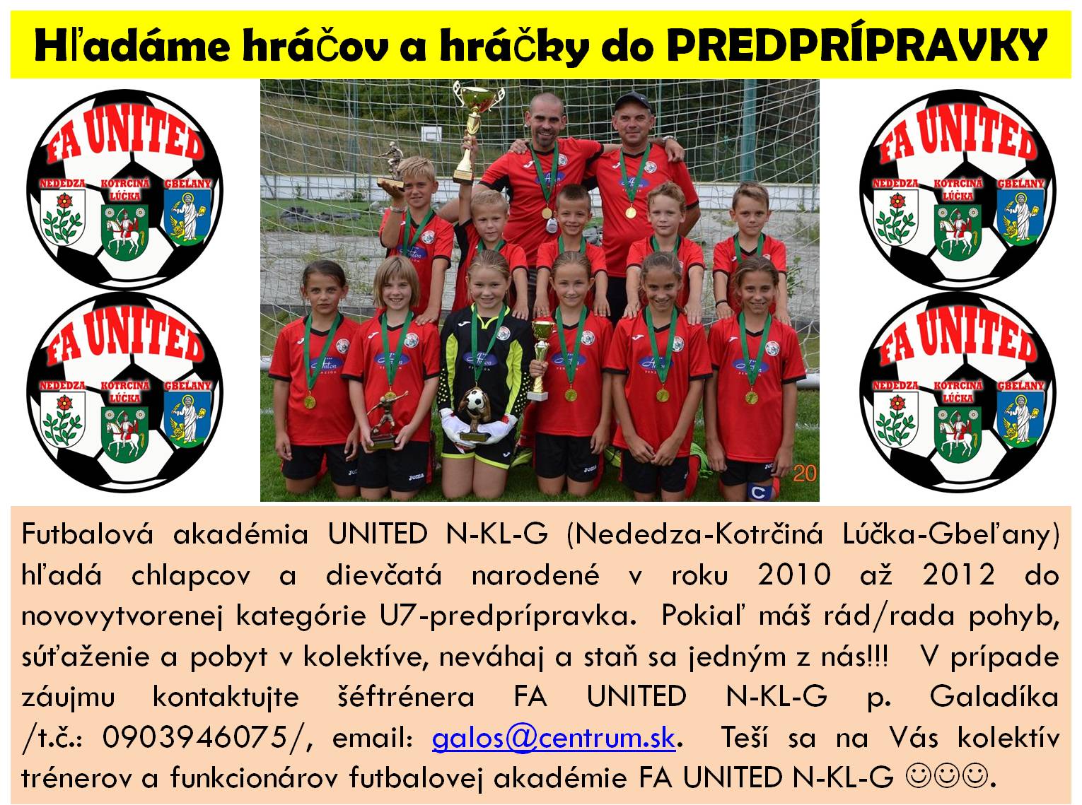 Futbalová akadémia UNITED N-KL-G (Nededza-Kotrčiná Lúčka-Gbeľany) hľadá chlapcov a dievčatá narodené v roku 2010 až v roku 2012 do novovytvorenej kategórie U7-predprípravka.