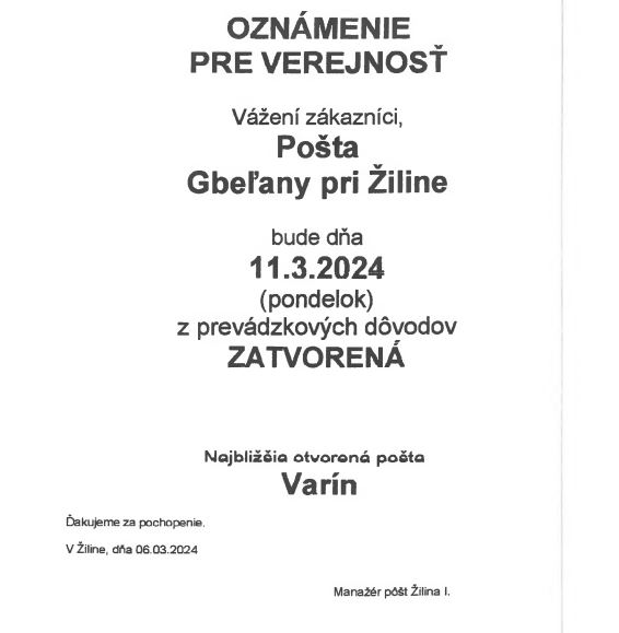 Pošta Gbeľany - oznámenie