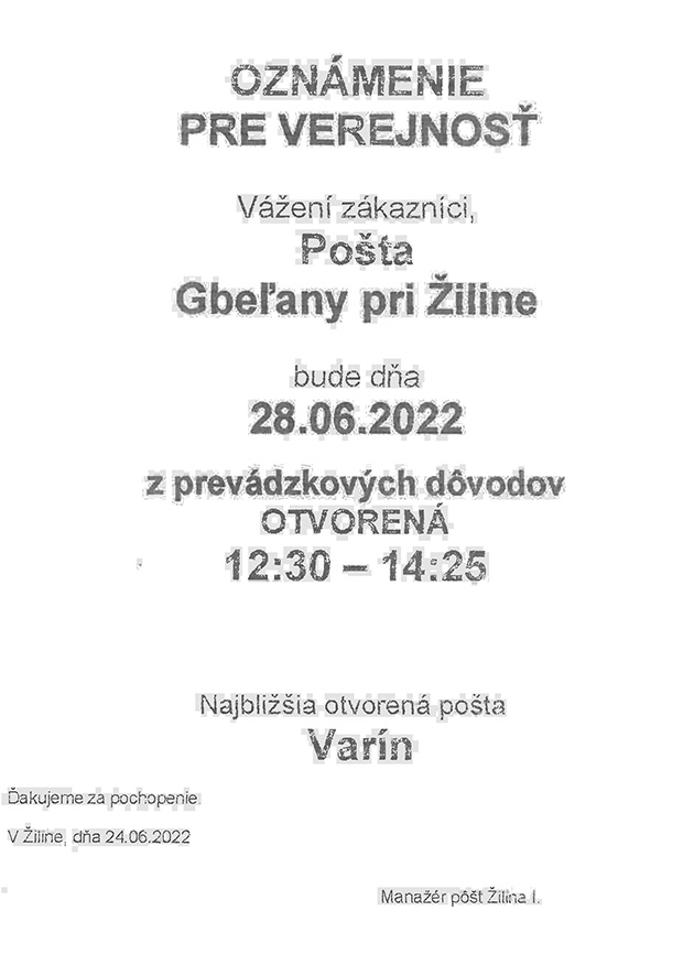 Pošta Gbeľany - oznámenie o obmedzení prevádzkových hodín pre verejnosť