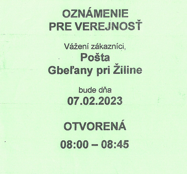 Otvorenie pošty 7.2.2023: 08:00h - 08:45h