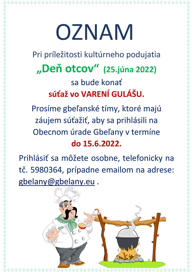 - Organizátor poskytne súťažnému družstvu príspevok vo výške 45,- € na zakúpenie potrebných surovín na uvarenie gulášu. Príspevok organizátora je súťažné družstvo povinné vyúčtovať do 24.6.2022 daňovým dokladom, ktorý bude v maximálnej výške príspevku.