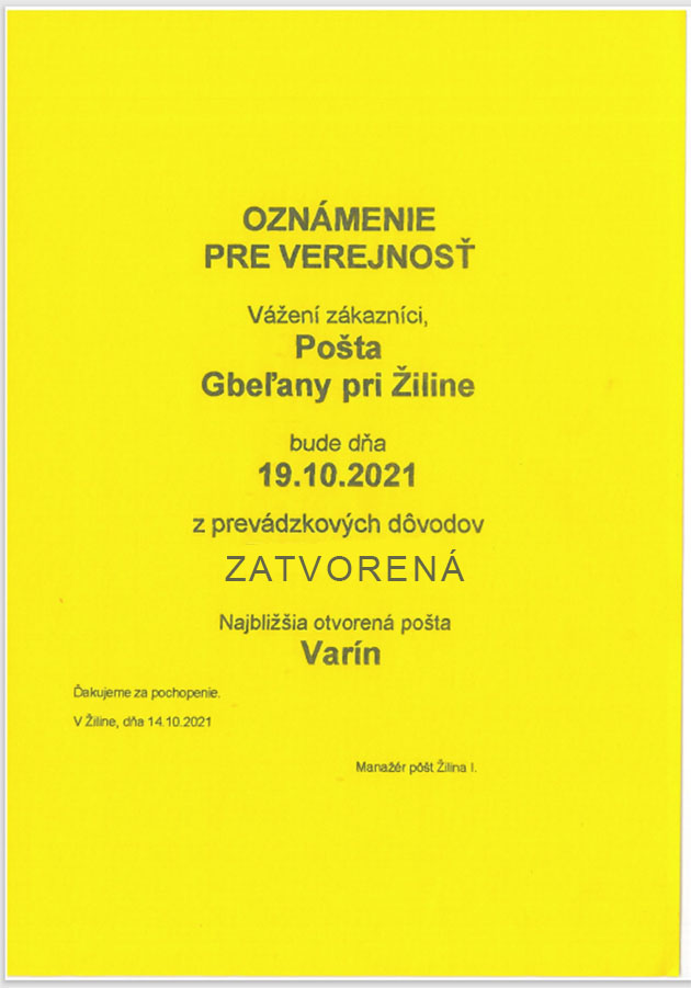 Pošta bude z prevádzkových dôvodov dňa 19.10.21 zatvorená.